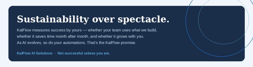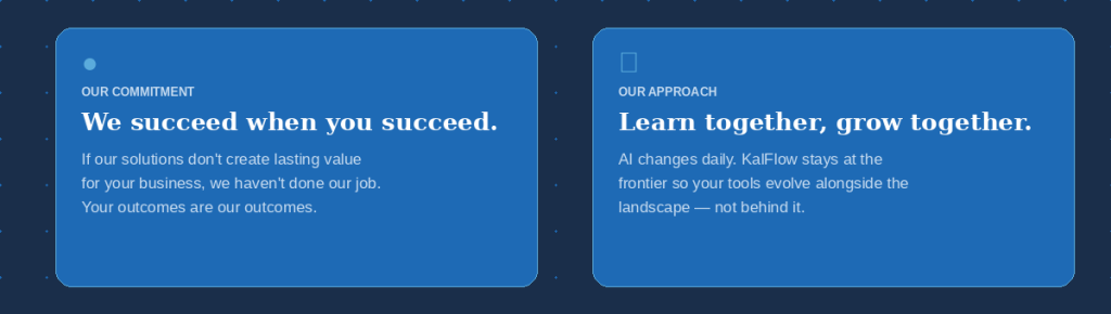 A lot of AI vendors will dazzle you with demos and disappear after deployment. KalFlow is built differently. We measure our success by yours — by whether your team actually uses what we build, whether it saves time month after month, and whether it grows with you as your business evolves.