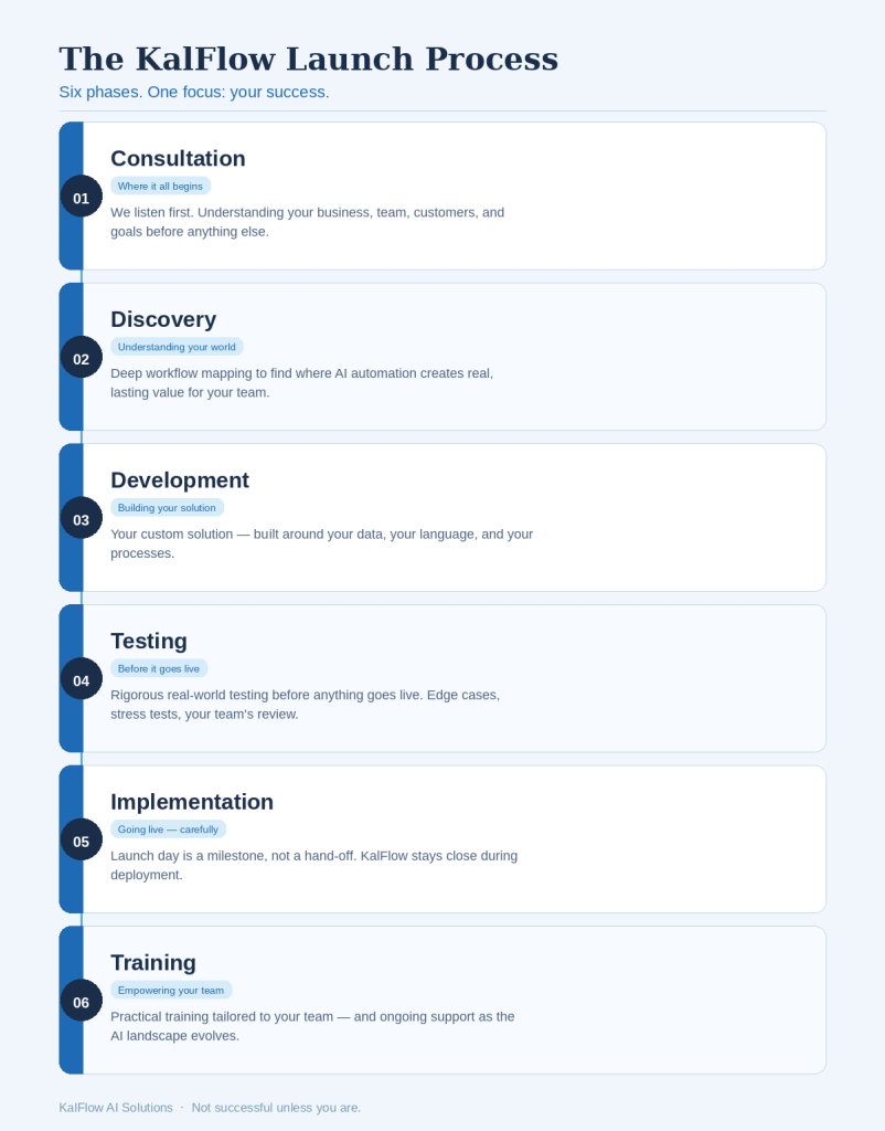Every local business is different — different goals, different workflows, different people. That’s why KalFlow doesn’t offer a packaged solution off the shelf. What we offer is a partnership: a structured, thoughtful process designed entirely around your success. Our launch timelines are tailored to you!